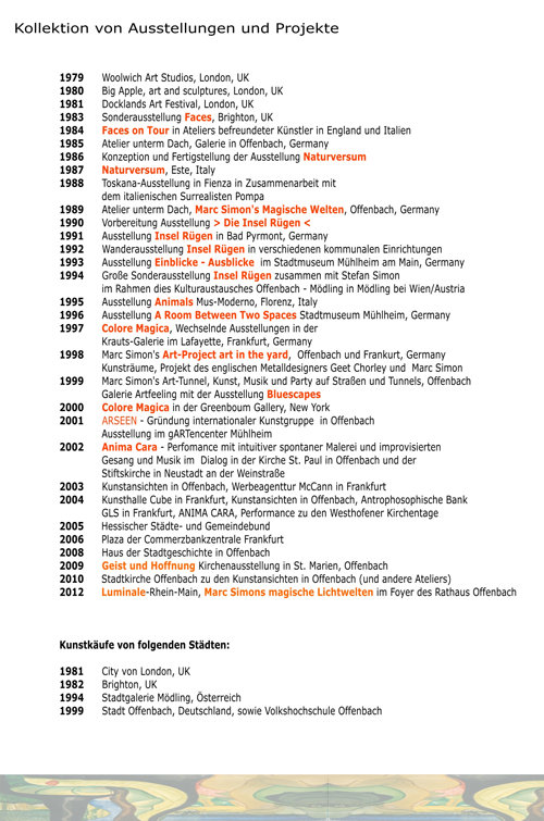 Marc Simon,im August 1960 geboren, hatte 1979 in London sein erstes Atelier und erste Ausstellungen. Seidem entstanden jährlich Ausstellungen im In- und Ausland. Anfang der 80er Jahre lernte er bei dem englischen Surrealisten Brain Dunes die Herstellung und Verarbeitung pflanzlicher und mineralischer Farben nach Rezepturen aus dem Mittelalter.